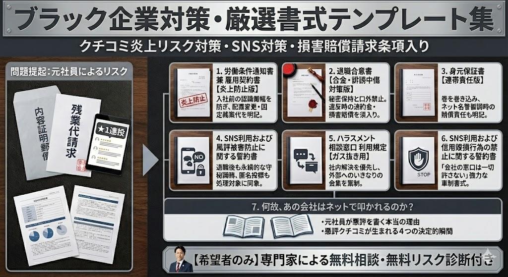 「ブラック企業」というレッテルは、外部の人間ではなく、「笑顔で辞めていった元社員」によって貼られます。退職後に届く、内容証明郵便と残業代請求転職会議やGoogleマップへの「★1」の連投「ここだけの話」としてSNSに晒される社外秘情報これらはすべて、入社・退職時の「書面の不備」が原因です。